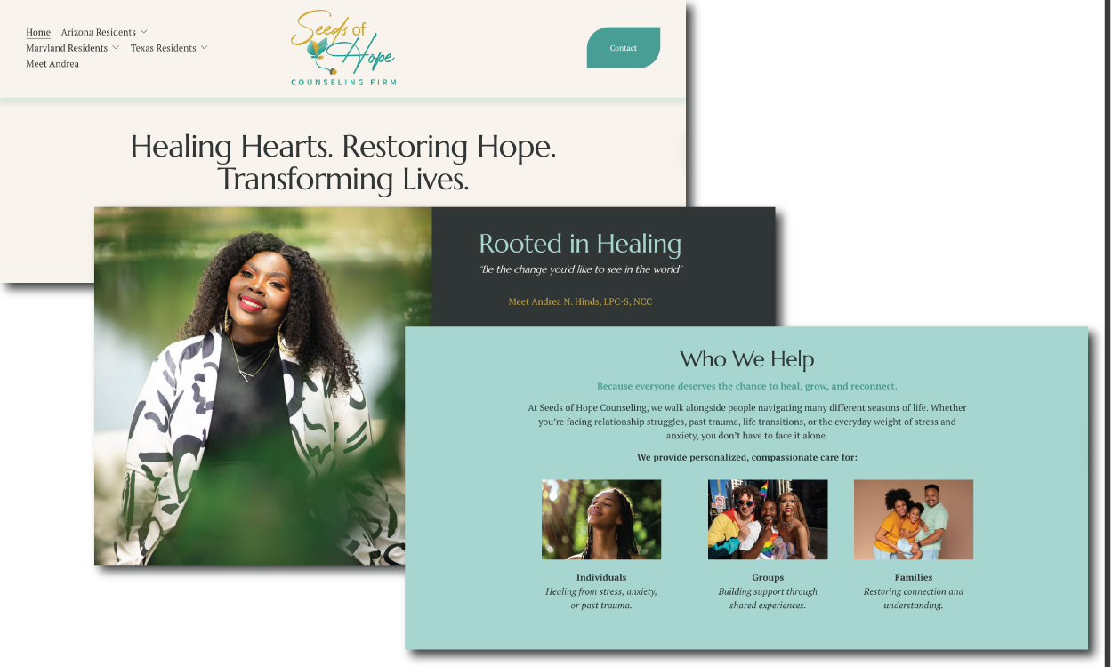 Seeds of Hope Counseling is a growing counseling practice rooted in healing, restoration, and meaningful growth. The client came to me seeking a refreshed visual identity and a more polished, cohesive online presence that reflected their compassionate, trust-building approach.